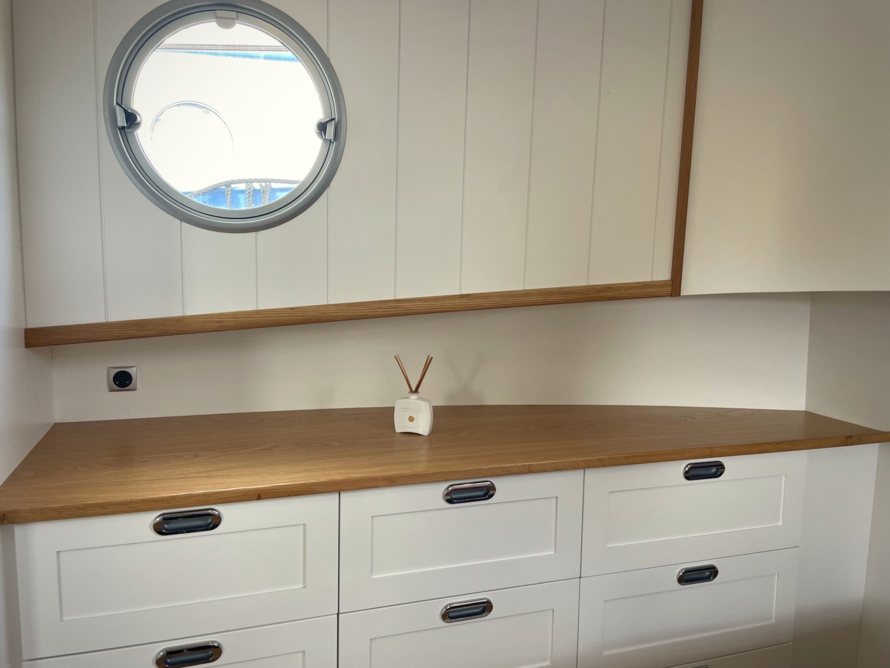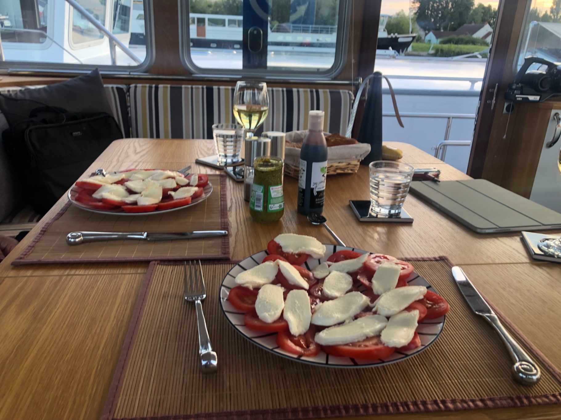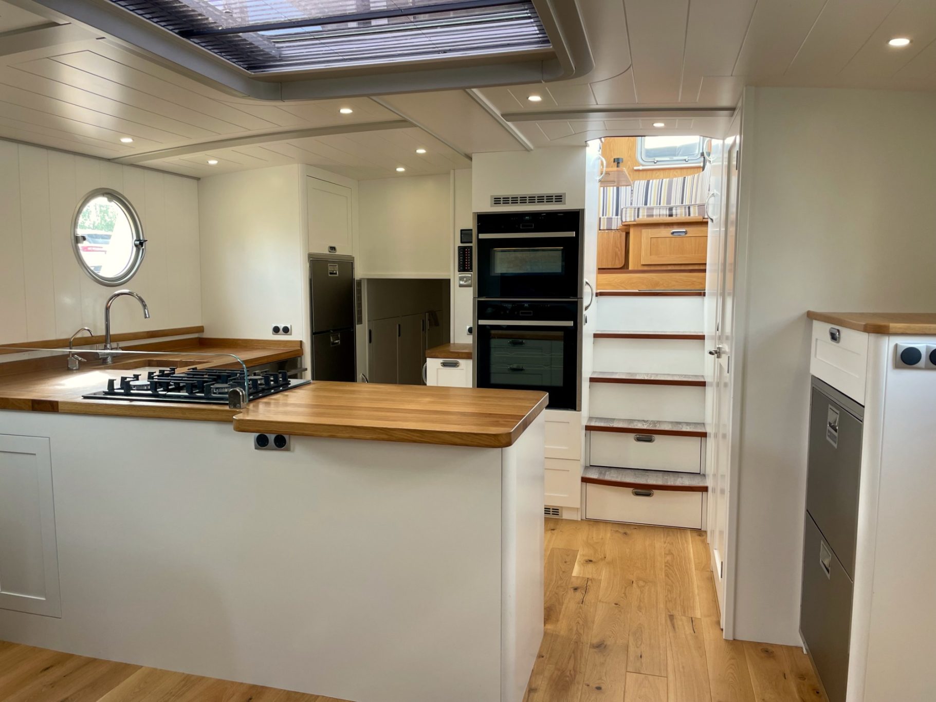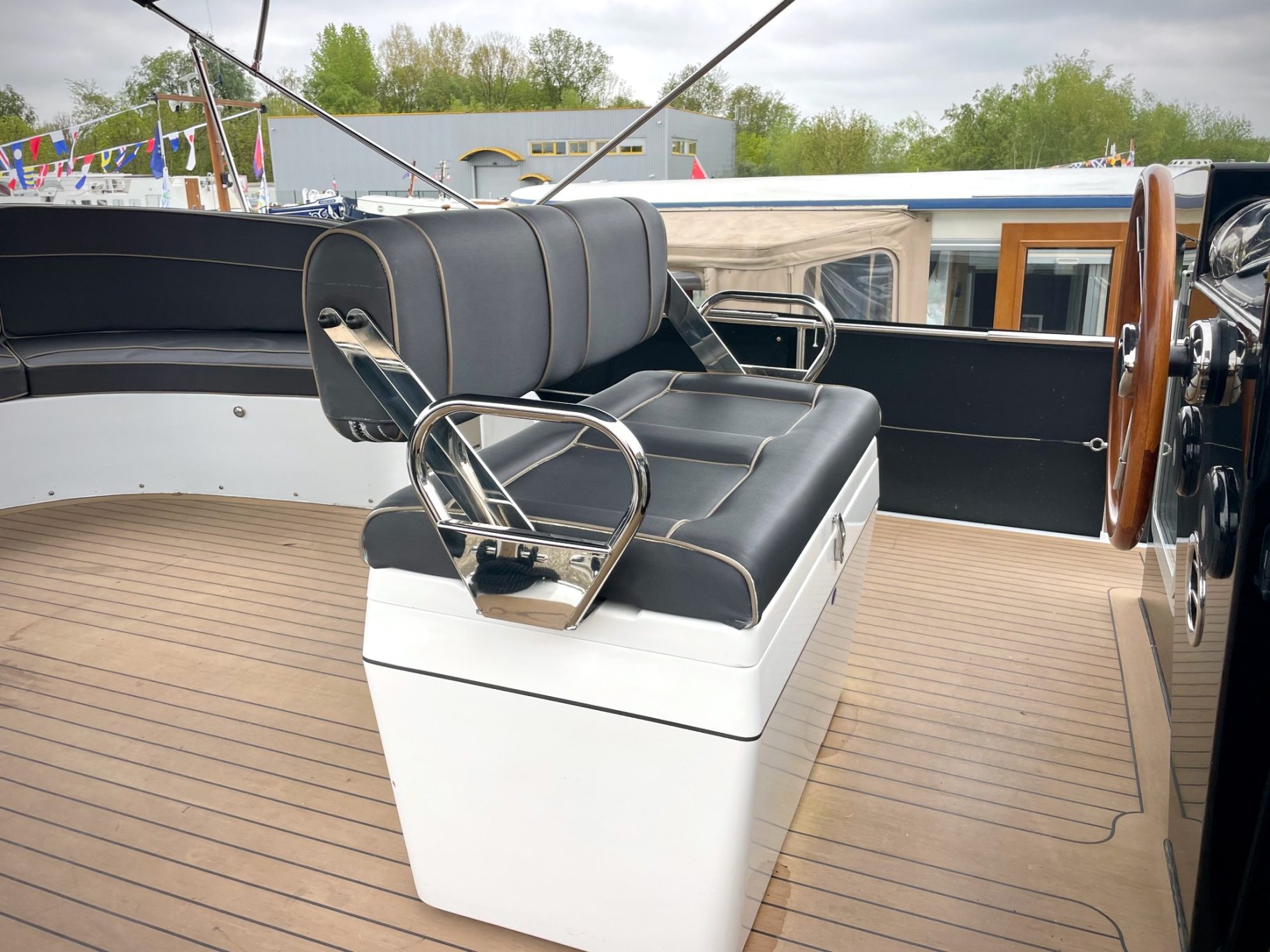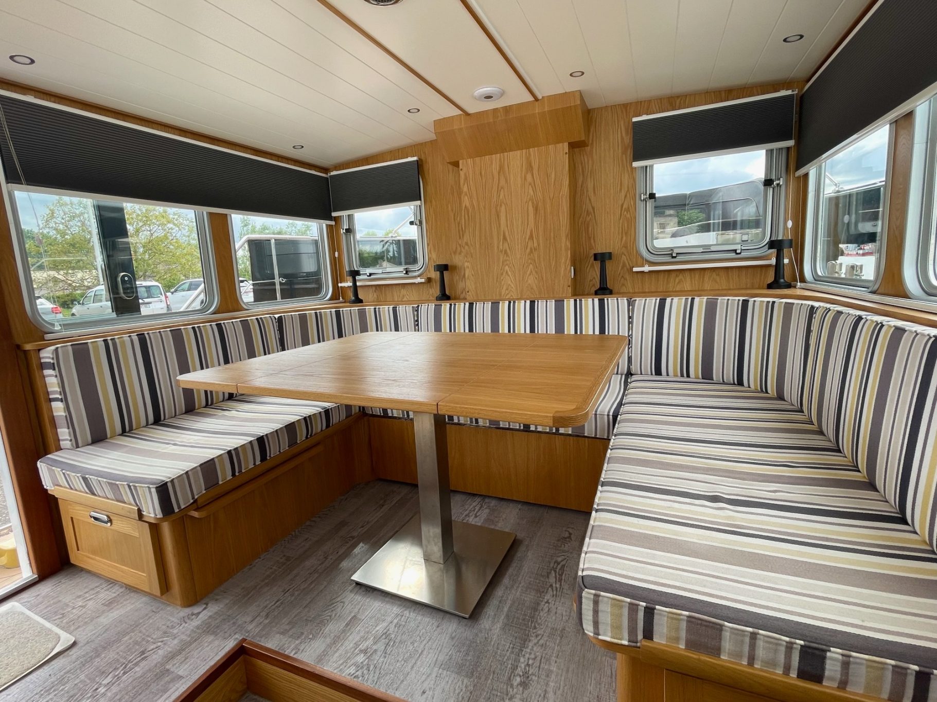Steuerhaus mit großem Esstisch und Rundumblick